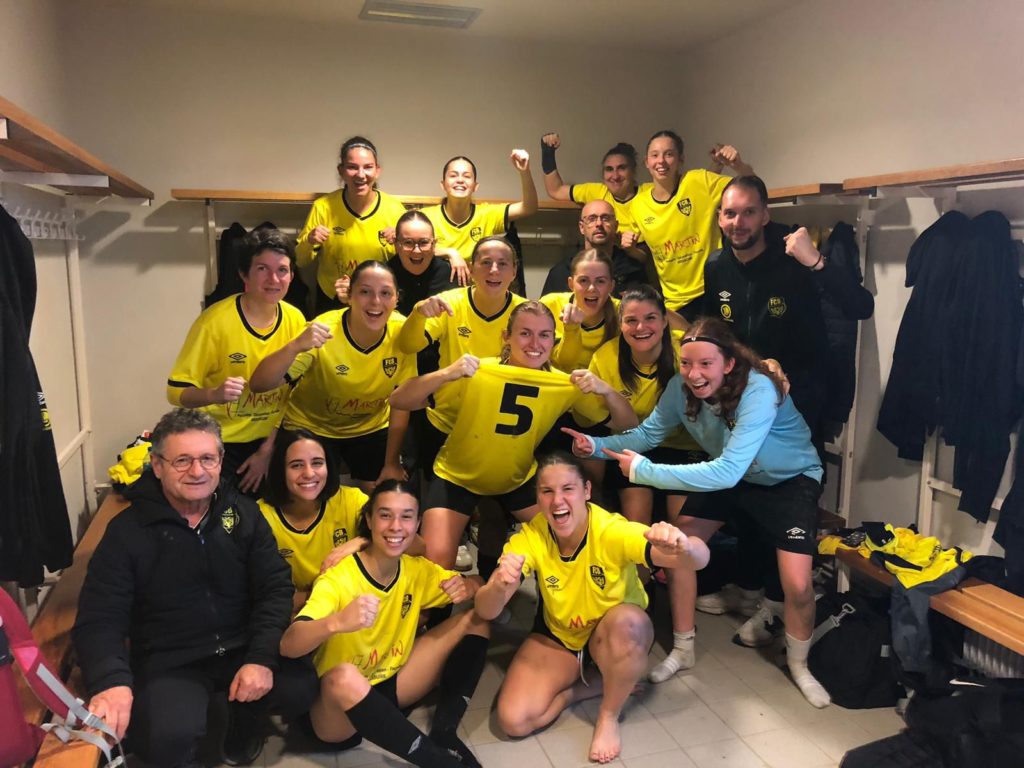 Retour sur le déplacement de nos féminines avec notre staff. Ce week-end, déplacement à Montmorillon pour notre équipe. Après une semaine de repos, les filles ont rechaussé les crampons pour affronter une valeureuse équipe de l’UESM.Malgré un bon début de match où nous mettons l’équipe adverse en difficulté grâce à un pressing haut, nous n’arrivons pas à être efficaces dans les derniers choix. L’équipe adverse se montre dangereuse en transition, et notre gardienne s’illustre sur un face-à-face remporté.À la 12e minute, sur une belle ouverture d’Ivania, Manon vient ajuster la gardienne (1-0). S’ensuit un corner de Lise, que Laurine reprend victorieusement du gauche (2-0).À la 37e, Lise frappe un coup franc lointain, dévié sur le poteau ; Manon suit bien et enfonce le clou avant la mi-temps (3-0).Lors de la deuxième mi-temps, nous prenons le dessus physiquement et nous scellons le match à la 85e minute grâce à une belle frappe de Lise, à 25 mètres, consécutive à une récupération haute (4-0). Un beau mouvement collectif viendra achever la rencontre à la 89e minute, lors duquel, une nouvelle fois, Manon sera trouvée en profondeur par Hélène (5-0).Une prestation qui confirme les qualités du groupe, même si nous devons encore gagner en maîtrise et en consistance dans le jeu.Félicitations aux filles