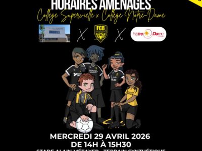 Option foot collège garçons & fillesEn partenariat avec le Collège Jules Supervielle Bressuire & le College Notre Dame Bressuire, le FC Bressuire organise des tests pour intégrer l’option foot au collège !!Pour les inscriptions, cliquer sur le lien suivant : https://forms.gle/hn4uYTMoA5qZrxfX9Pour tout renseignement, veuillez contacter... Plus d'infos !