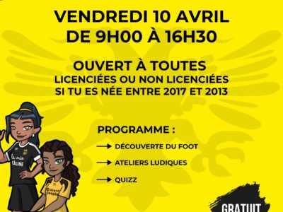 Ramène ta copine ! Tu es née entre 2013 et 2017 et tu as envie de découvrir le football ? Nous t’attendons le vendredi 10 avril de 9h00 à 16h30 pour vivre une journée 100 % foot, pleine de jeux et de découvertes ! Viens... Plus d'infos !