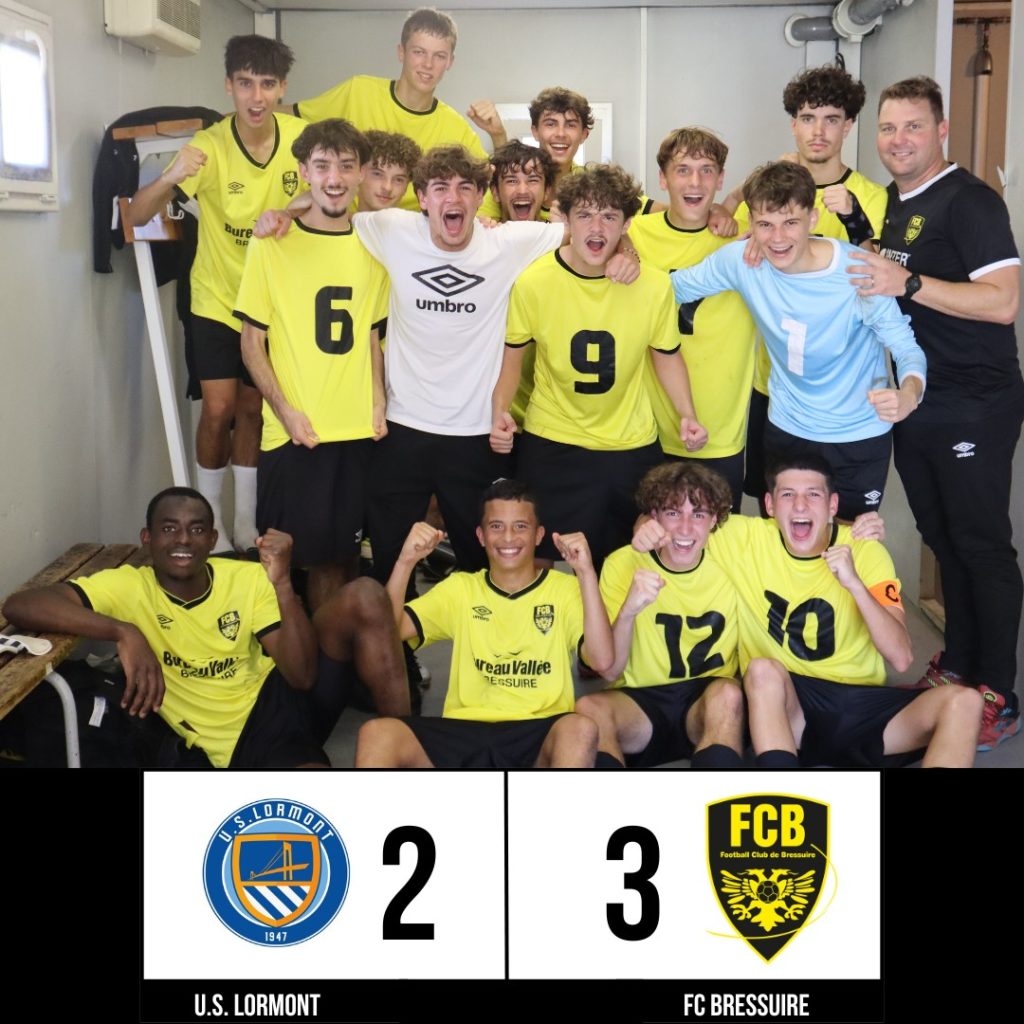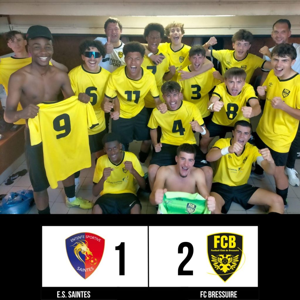 Retour avec notre coach Fred COGNY : « Déplacement à Saintes ce week-end pour nos jeunes. Après la victoire à domicile de la semaine dernière, nous avions à cœur de poursuivre notre série de victoire à l’extérieur. Après une entame tonitruante (2-0 au bout de 8 minutes) grâce à une superbe frappe de Rayane des 25 mètres et un but de la tête de Ben Mansoib à la réception d’un coup franc les débats s’équilibrent. Un match haché avec de nombreux arrêts de jeu qui n’a pas permis à la rencontre d’être de qualités des deux côtés. Cependant nos jaune et noir ont montré de belles choses et un sang froid exemplaire. Malgré la réduction du score, sur penalty à la 85 ème, nous obtenons 3 points précieux qui nous permettent de prendre provisoirement la première place en attendant les match en retard de nos adverses !La route est encore longue, aux garçons de garder le curseur élevé pour progresser
